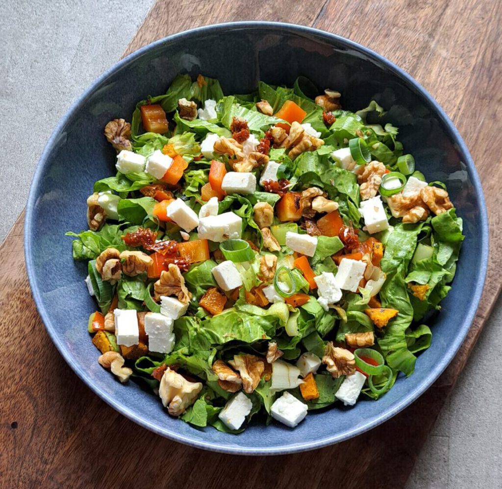 Een kleurrijke salade met geroosterde winterse groentes, waaronder knolselderij. Fris van smaak door de toevoeging van stukjes appel. Écht een aanrader!